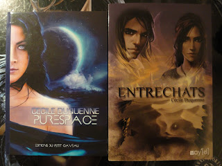 Enfin, si je suis allée au salon Autres Mondes, aujourd’hui, c’était avant tout pour rencontrer Cécile Duquenne dont j’apprécie l’écriture et avec qui j’échange même parfois sur Facebook. Cependant, il n’y a pas à dire, Facebook, ça vaut pas le « face to face » ! Même en ayant vu des photos d’elle sur la toile, je l’ai trouvée mieux en vrai ^^ Et puis surtout, elle est super accessible !!! Pour preuve : je l’ai abordée en mode inconnue mais elle m’a de suite mise à l’aise, me tutoyant et me parlant tout à fait normalement, pas comme certains auteurs peuvent vous aborder pour « vendre leur bouquin ». Et en parlant de bouquins… je lui en ai pris deux ! Tout d’abord Purespace pour continuer de soutenir les Editions du Petit Caveau et parce que j’hésitais à le prendre de toute façon ; et ensuite Entrechats pour lequel elle m’a dit un truc du genre « t’es pas obligée » (pas là pour « faire de la vente » je vous dis !), mais auquel je ne pouvais que succomber après lecture de la quatrième de couv’ et présentation de l’auteur ! Il faut dire que l’Egypte et moi (ok ok, pas vraiment l’Egypte… mais l’Egypte quand même !), c’est une longue histoire !!