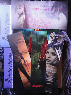 Enfin, en l’absence de SoFee L. Grey, je me suis dit qu’il me fallait absolument un cinquième livre ! Du coup, je suis allée sur le stand des éditions Rebelle et ai profité de la présence d’Aurélie Mendonça pour me mettre aux zombies avec Zombitions. Cela fait un moment que j’ai envie de lire cet auteur, mais ses Tarots divins ne semblent pas faits pour moi. Alors, surfant sur la vague zombie, j’ai décidé de lui prendre le « premier tome » qu’elle m’a en fait présenté comme un one shot malgré la récente sortie de Zombiguité.